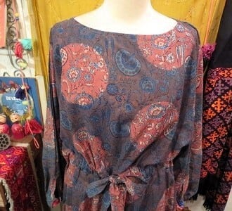 アクセントはベルトの先と袖元のゴムが入っている部分に、グジャラート州のvintage の生地を使っているところ。