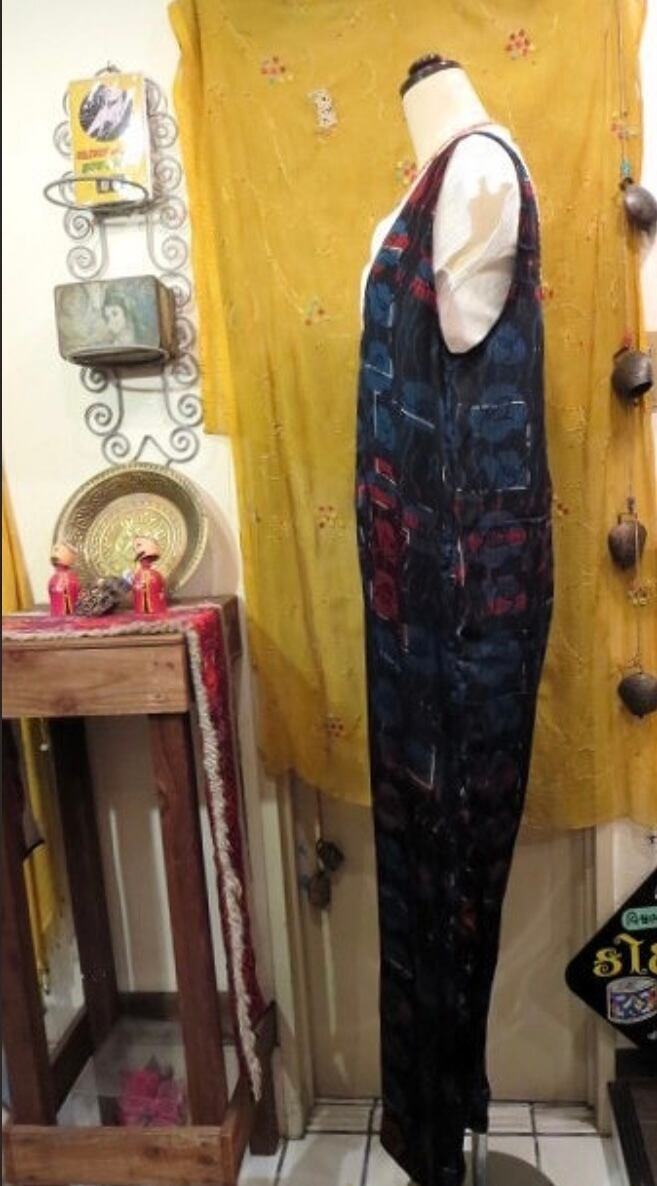 そんな工程から生まれた、こちらはmodal(モダール*レーヨン)の生地に深いインディゴと茜色の花柄の流れるような柄のブロックプリントを施した生地をサロペットに仕立てて貰いました。
