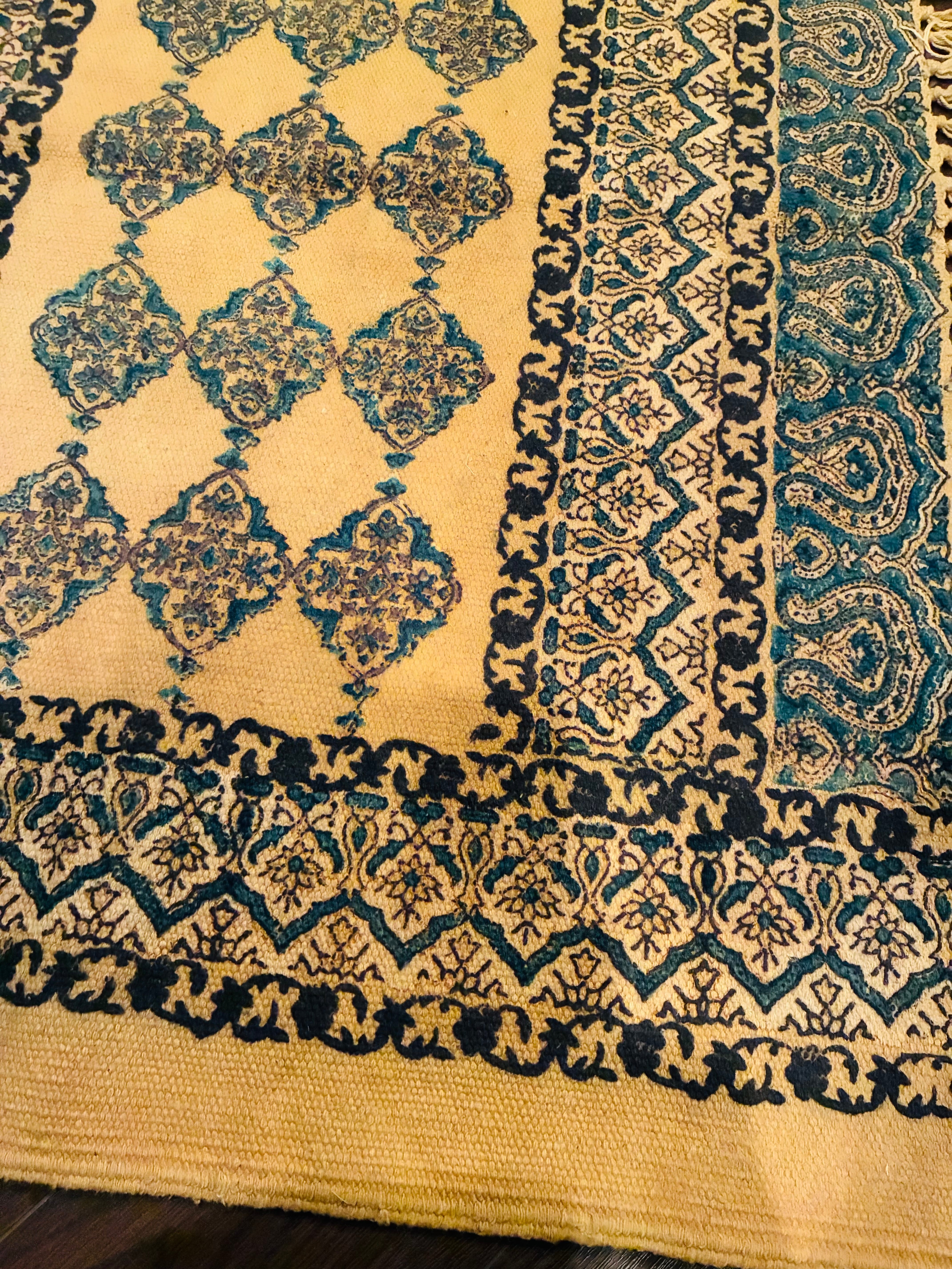 そんな工程からうまれたアジュラックの天然の藍染め染料と草木染で染められたcotton rug.