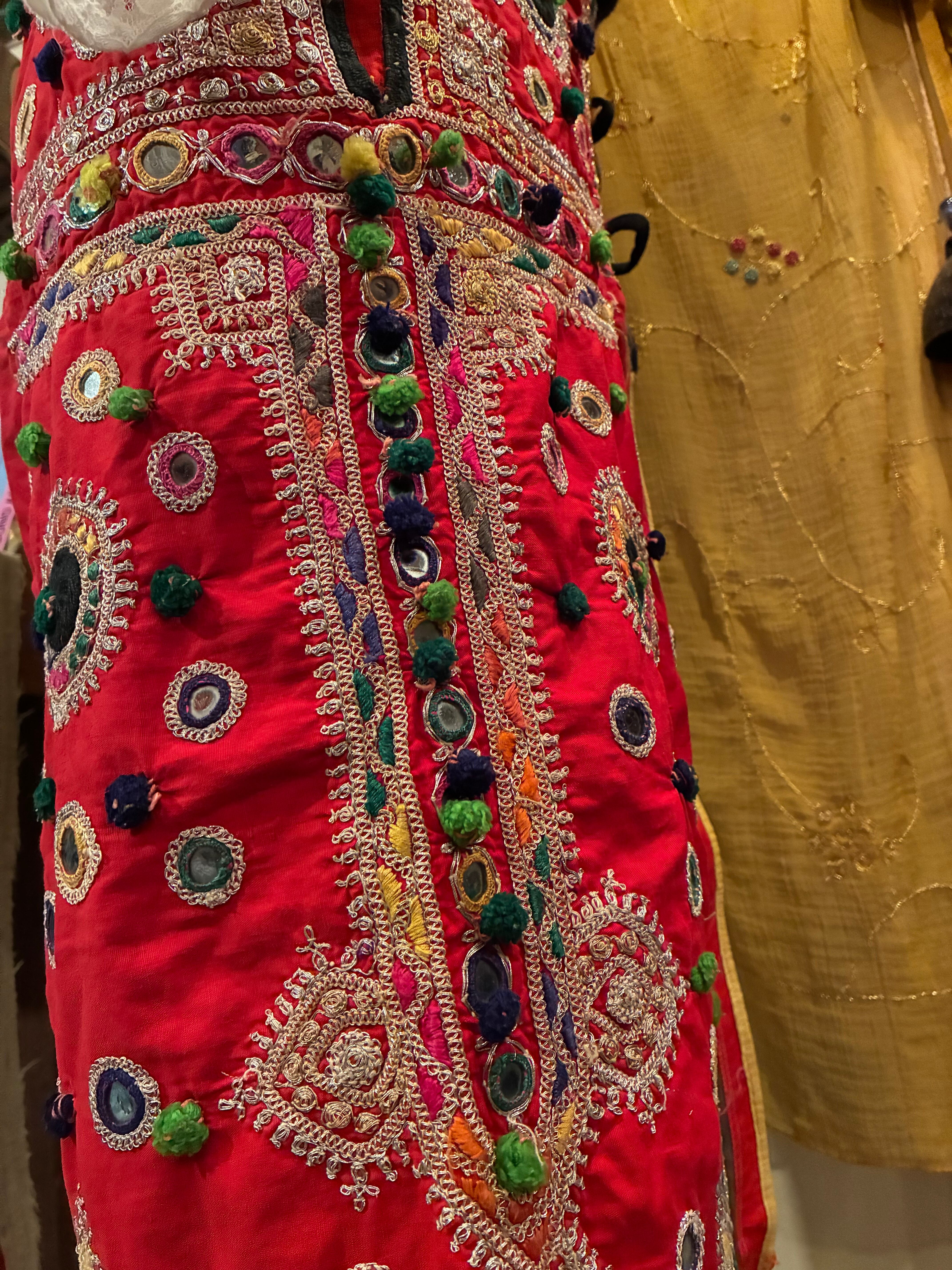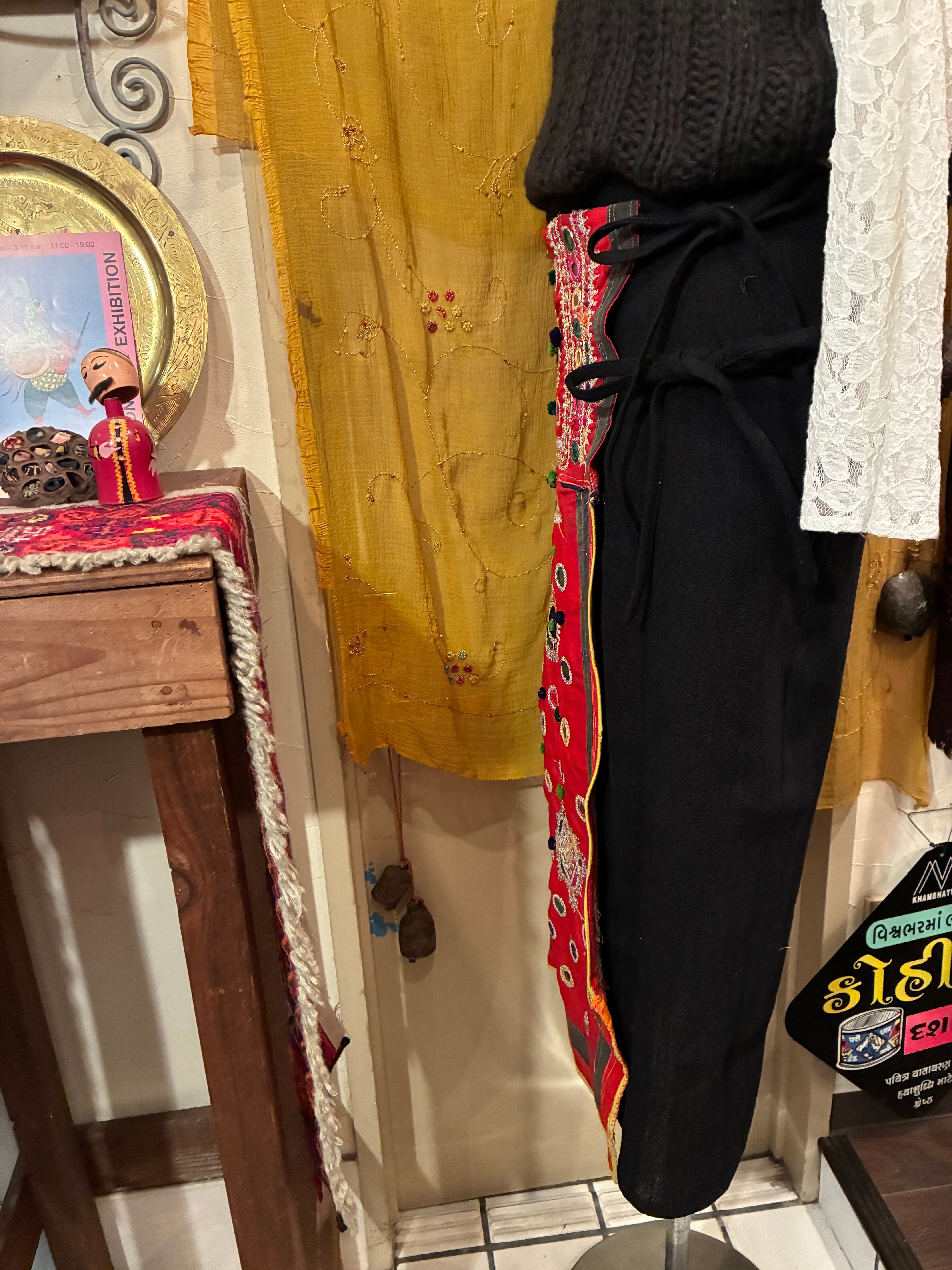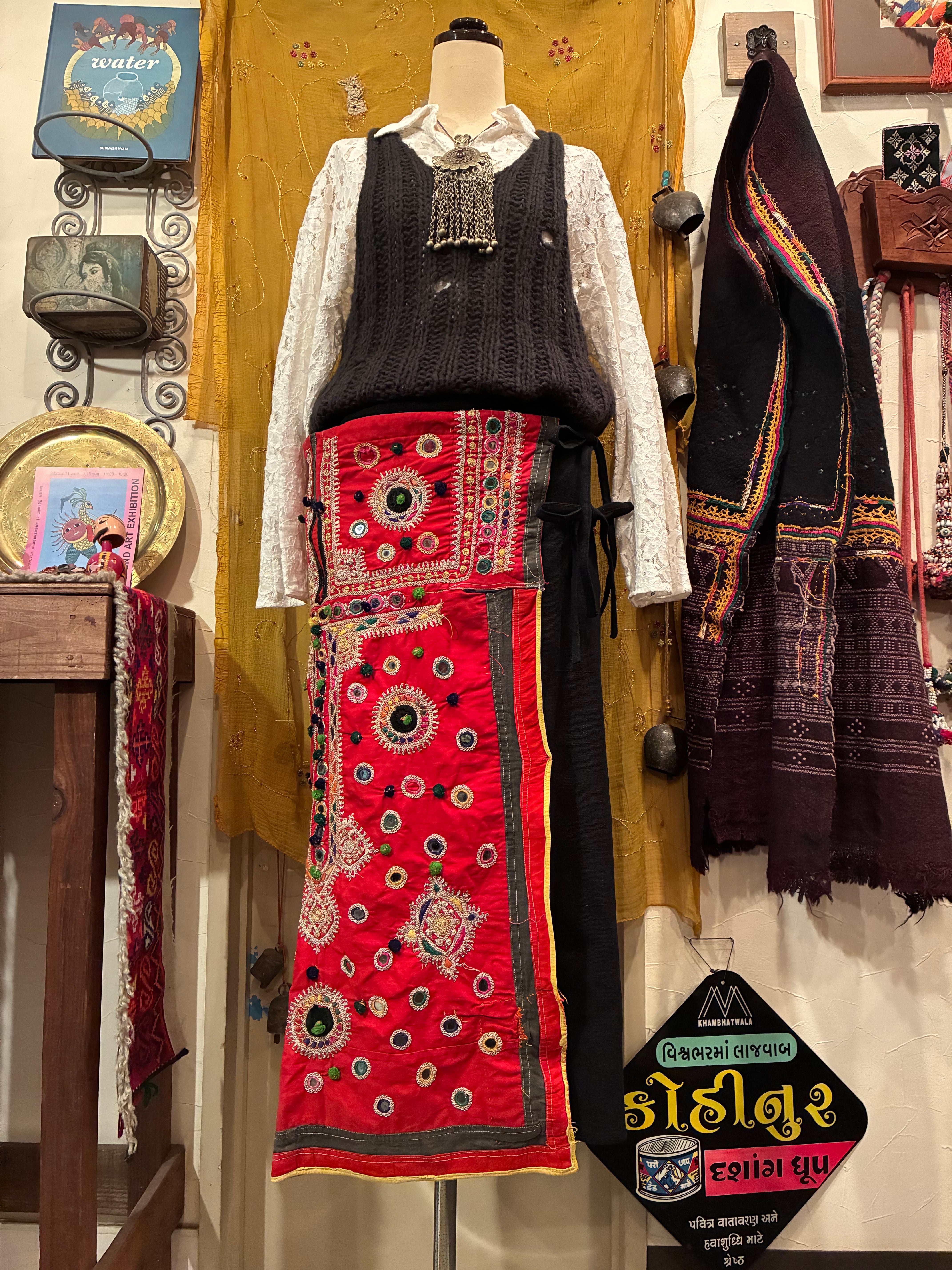 インド西部、グジャラート地方に定住する民族の女性が縫い上げた様々なデザインのvintage生地を使ったカラフルな布をラップスカートに仕立てて貰いました。