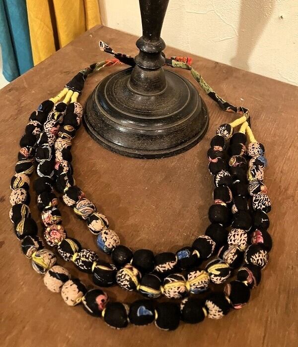 形はインドで人気のある、3連タイプで、丸玉は一つずつ縫われて繋ぎ合わせられ、紐の部分との色の違いのコントラストも素敵です。