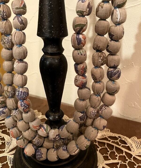 こちらは優しいグレーベースの生地に小さな花のプリントで丸玉を繋げる糸が綺麗なブルーです。これは紐とのつなぎ目の糸の色と合わせています。