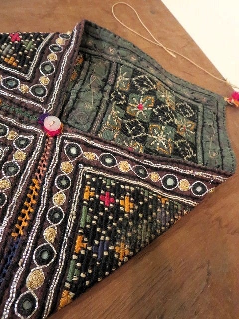 ミラーは1つも取れる事なく付いていて下の3つのポンポンも古いながらしっかりついています。細かい生地と生地との縫い合わせの部分の糸の色や刺繍の細かさに見とれてしまいます。