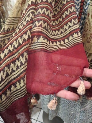繊細な細い糸で織られた生地に緻密なブロックプリントを施し、丁寧に洗い、染め、の工程を繰り返す手作業。