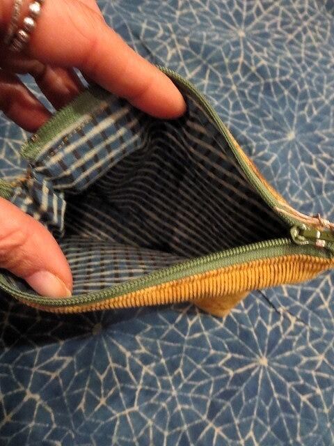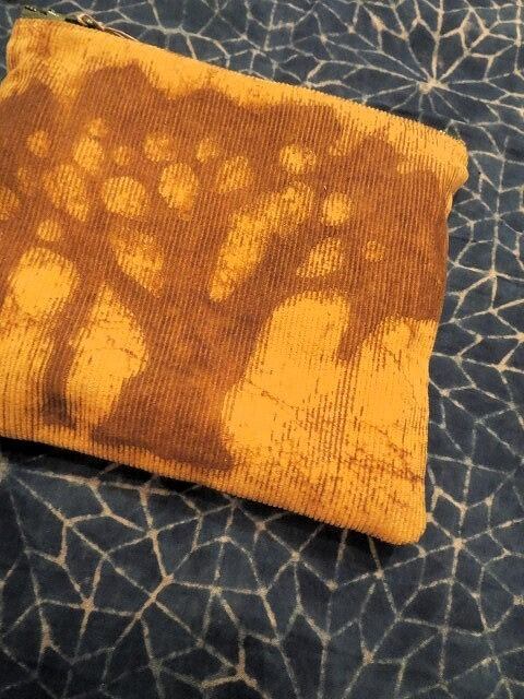 フェアトレードを推進するメーカーが作った気持ちのいいナチュラルな細いコーデュロイ生地に木の模様の染が入ったかなり珍しいデザイン生地をポーチにしてもらいました。