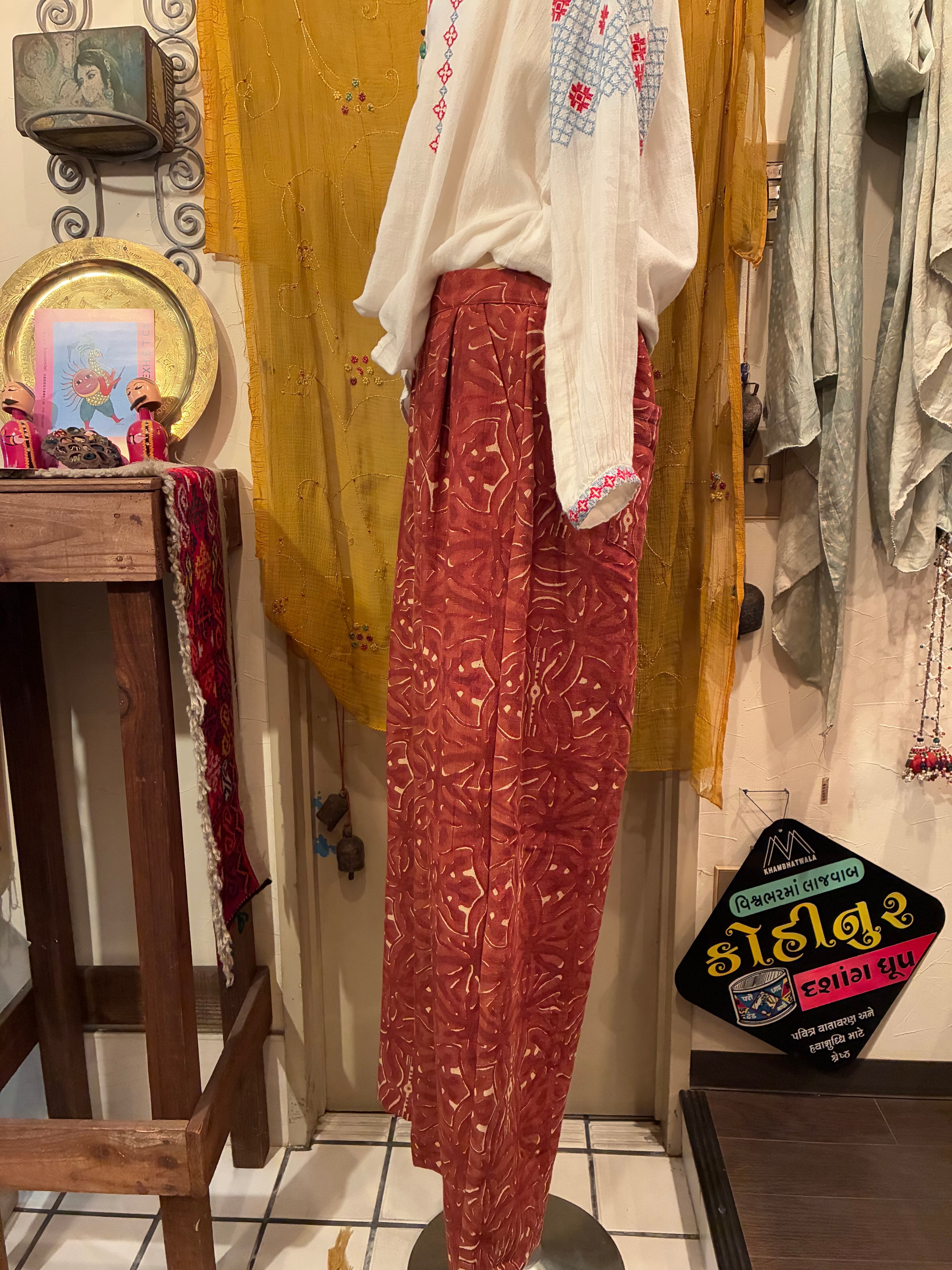 鉄や土、植物からの色を染料とした、気持ちのいい生地、そして、タックが入る事でラインも綺麗な一本です。