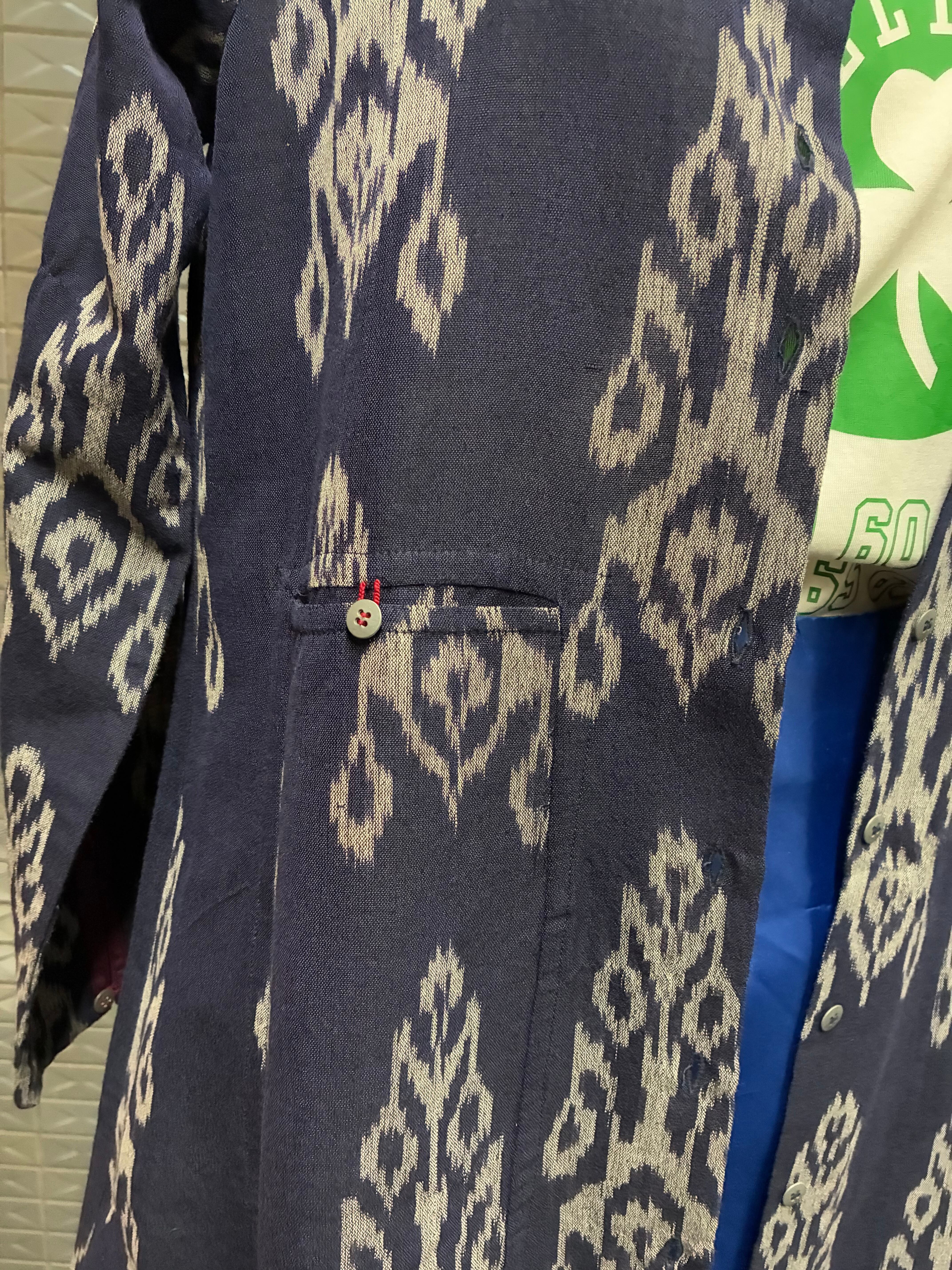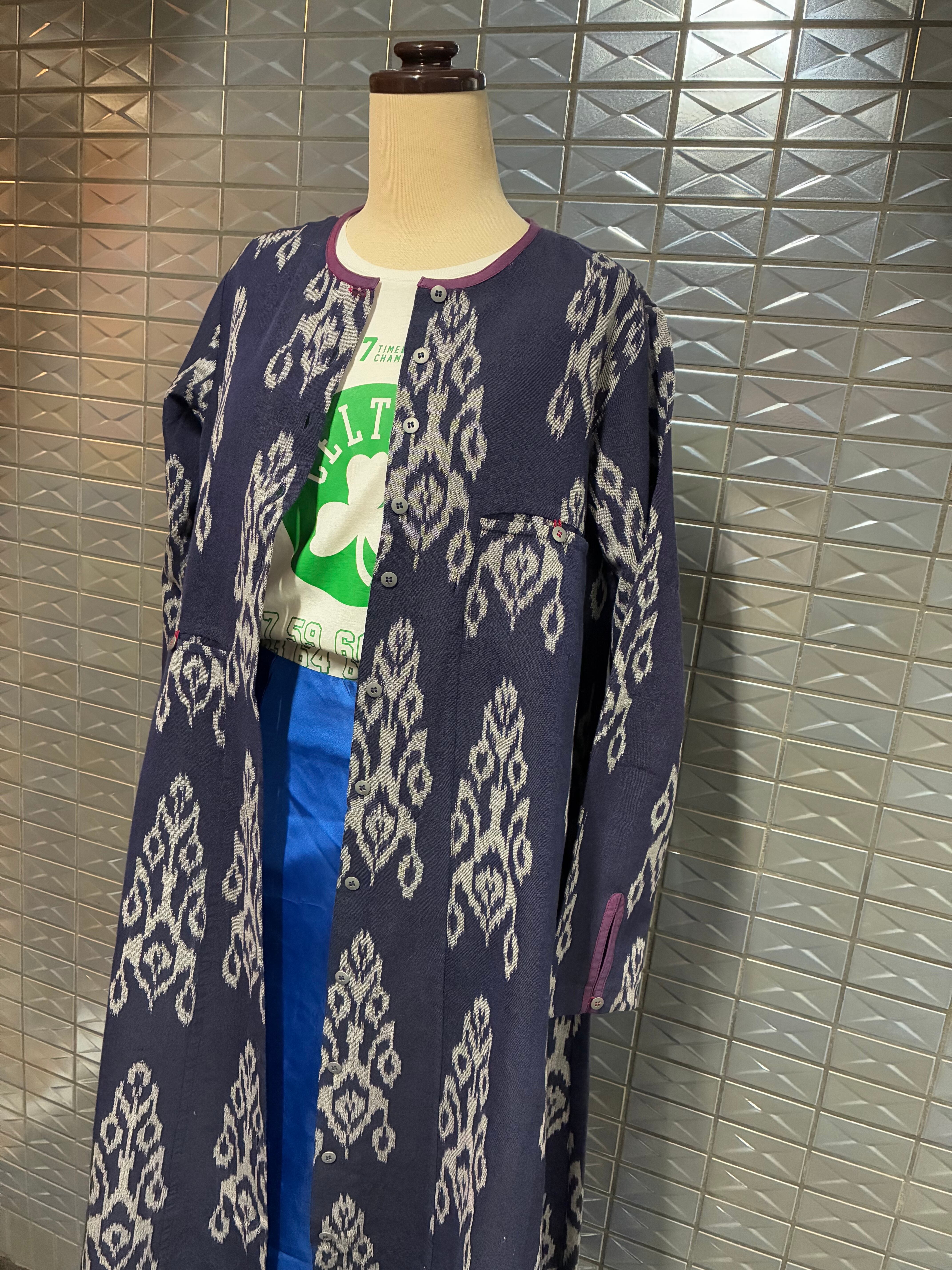 こちらはフロントは下までボタン付きで開閉出来、左右胸下にそれぞれ位置の違うポケット、ボタンループの色糸はカラー使い、袖口、裾、襟などにはいるトリミングにも上品な色使いが施されています。